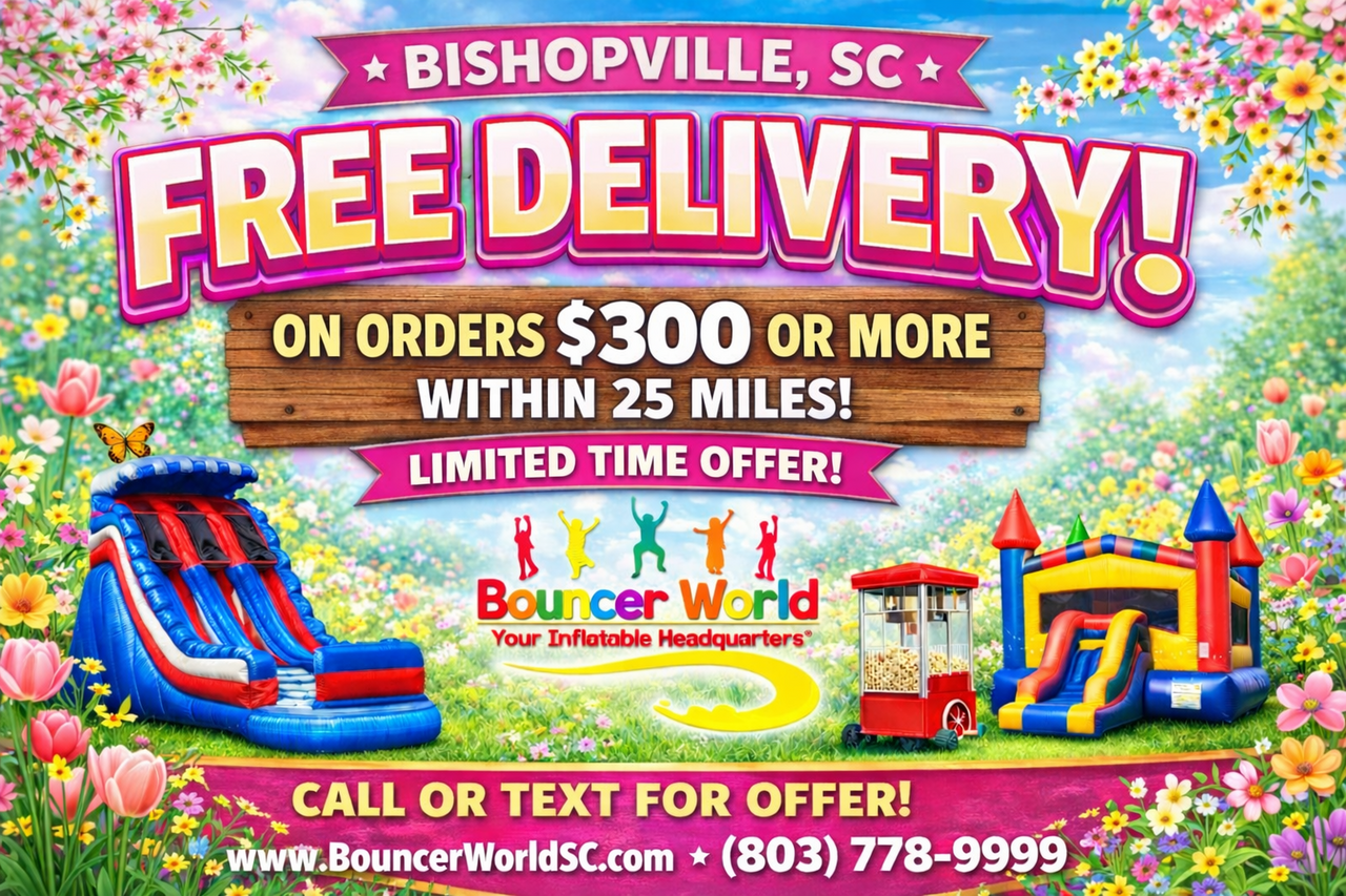 Bouncer World is excited to offer FREE delivery on orders of $275 or more within 25 miles of our warehouse! This limited-time spring promotion makes it easier than ever to bring the fun to your next party, school event, church gathering, or community celebration.