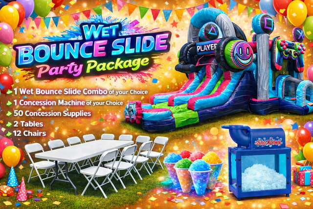 Bouncer World offers a variety of Wet Bounce House & Slide Party Packages in Camden, SC. Our bounce house combinations feature a large bouncing area, basketball hoops, pop up obstacle logs, and large slides. Our Bounce House Party packages include a Fun Food Machine of your choice along with servings for 50 guests, two tables, and 12 chairs. Everything you need for a successful event.